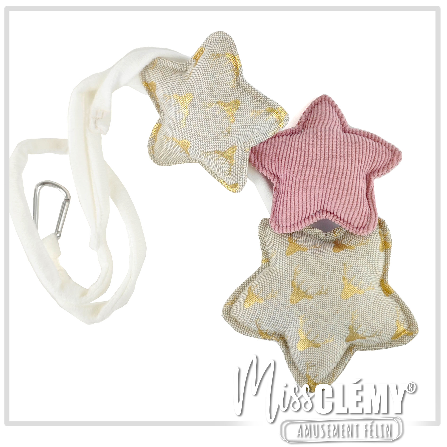 Conçues pour être attachées partout (arbre à chat, poignées…), elles cachent un petit grelot discret.